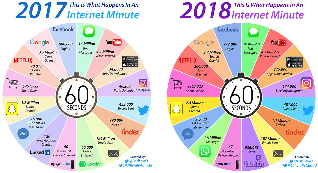 L’infografica è di Lori Lewis e Chadd Callahan di Cumulus Media , e mostra l’attività che si svolge su varie piattaforme come Facebook o Google in ogni intervallo di 60 secondi. Cresce tutto, chiaramente. Il balzo più evidente è quello di Netflix che passa da 70mila a 260mila ore di show visionati. Poi tre novità: entrano Spotify, Twitch e i prodotti con Amazon Alexa della famiglia Echo. C’è ancora Snapchat, oggi se lo chiedi a un giovane non sa neppure cosa è.
